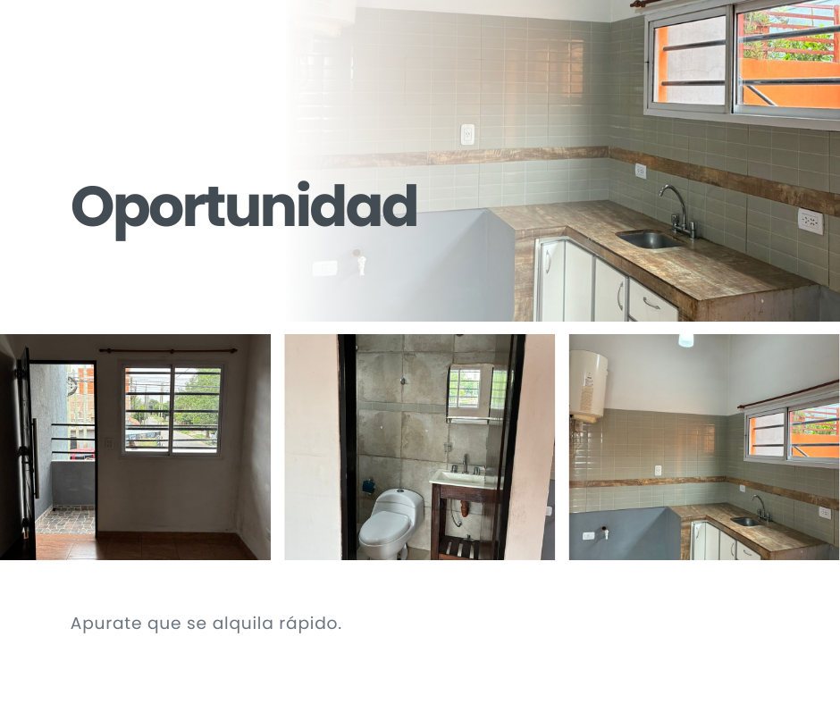 Primer piso con balcón. Cocina-comedor y baño. Incluye espacio techado para moto/bici. Ubicación estratégica con comercios en la puerta y gran acceso a transporte (a 300m de Cno. Gral. Belgrano). Precio: $400.000 por mes. ¡Listo para ingresar! Consulte requisitos.