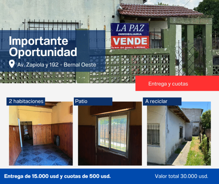 Ubicada en Av. Zapiola y 192. Casa de 2 habitaciones y patio, ideal para reciclar y poner a tu gusto.Plan Flexible: Alquiler con opción a compra.Financiación Directa: Entrega de U$S 15.000 y cuotas de U$S 500.Valor Total: U$S 30.000. Dejá de pagar alquiler y empezá a pagar tu propia casa!